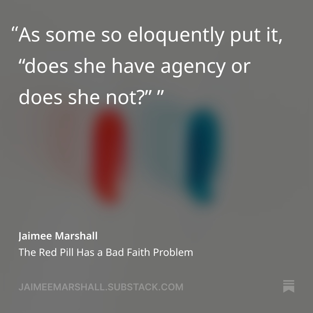 So I’m not surprised Jaimee accuses us of a bad faith problem. She’s not wrong. We don’t care. It’s not easy not to care, in fact you have to do a lot of work to stop giving that gift away to everyone. We don’t talk about this stuff with an attention to get women to approve of us. We neither want or need the approval.